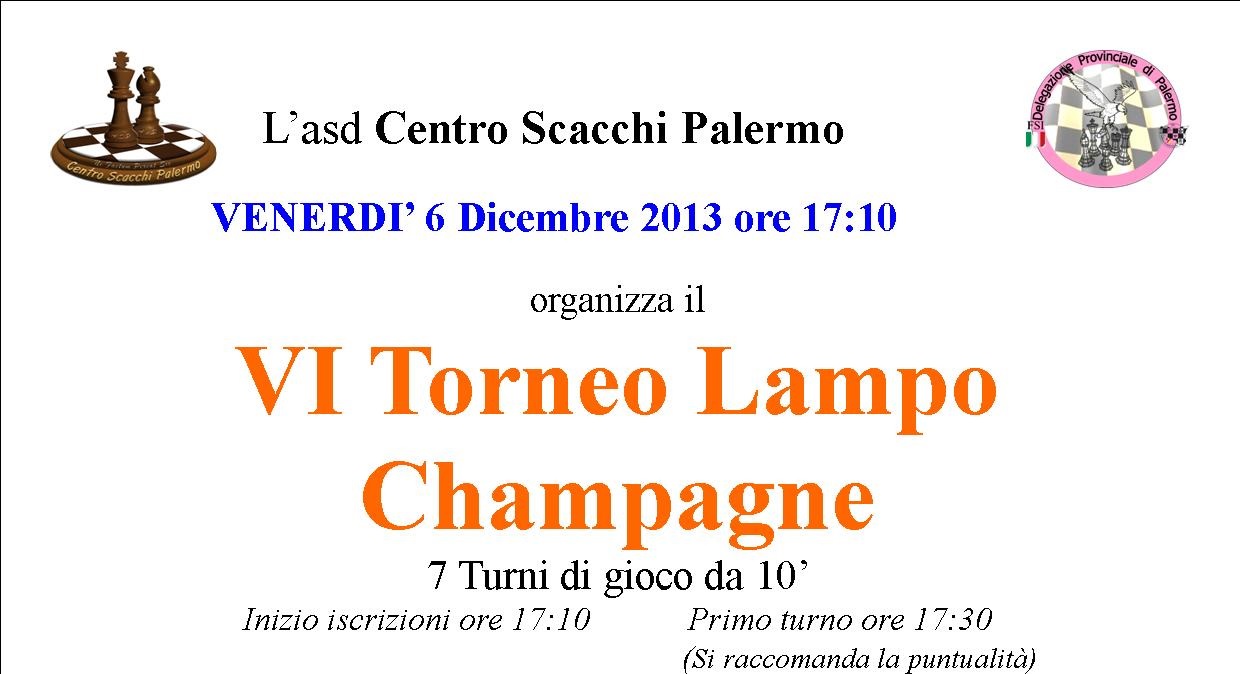 VI Lampo Champagne_1.0 Venerdì 06 Dicembre alle ore 17:30 si svolgerà, presso la nostra sede, in Via E. Fermi, 8, la sesta edizione del Torneo Lampo Champagne Previsti 7  turni di gioco da 10′. Premi previsti: 1° Classificato – Coppa 2° Classificato – Coppa 3° Classificato – Coppa 1°<1800 – Coppa 1°<1600 – Coppa 1° NC – Coppa 1° e 2° U16 NC – Coppa Vi aspettiamo per trascorrere assieme un pomeriggio di divertimento. Team Centro Scacchi]]>
