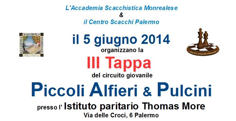 Bando 3 tappa Bando 3 tappa[/caption] Giovedi  5 giugno 2014 alle ore 15:00, si svolgerà la terza ed ultima tappa del circuito  “Piccoli Alfieri e Pulcini”,  presso l’Istituto paritario Thomas More. Il torneo patrocinato dalle ACLI e dalla MSP, si avvale della organizzazione del Centro Scacchi Palermo e dell’Accademia Scacchistica Monrealese. La terza tappa, come è noto,  è  aperta a tutti e possono partecipare   i giocatori di tutte le scuole, non oltre il decimo anno d’età. Oltre ai premi e gadget messi a disposizione dalla US ACLI Sicilia (medaglie e magliette per tutti) caratteristica del circuito è la consegna della maglia azzurra Sicilia. I giocatori vincitori delle tappe  precedenti  hanno avuto modo di indossarla e difenderne il titolo  come vincitore  assoluto  e di fascia  nelle gare precedenti del circuito. Come previsto, a fine circuito sarà anche premiata la scuola vincitrice, sommando i punti presenza di ogni giocatore e i risultati ottenuti dai migliori classificati. Team Centro Scacchi]]>