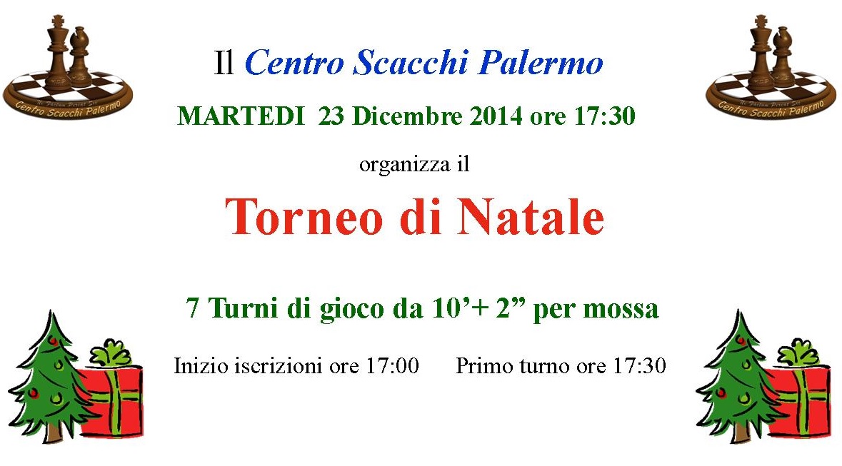 Il Centro Scacchi, martedì, 23 Dicembre alle ore 17.30, organizza il Torneo di Natale, presso la propria sede, in via Enrico Fermi, 8 – Palermo.