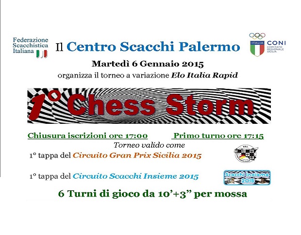 1 Chess Storm Con il 1° Rapid Chess Storm, martedì 6 Gennaio 2015 alle ore 17:00, riparte l’attività del Centro Scacchi in Via E. Fermi, 8 (PA). Il torneo, che si svolgerà con 6 turni da 10′ + 3″ per mossa, è valido per il Circuito Gran Prix Sicilia 2015 con variazione ELO Italia Rapid. Vi ricordiamo che questa è la 1° tappa del Circuito Scacchi Insieme 2015. Il circuito/progetto, ideato dall’Associazione Scacchistica Monrealese, ci vede questo anno protagonisti dell’evento, tutti i tornei, previsti nel nostro calendario, faranno parte integrante della classifica finale. Come già presentato, in queste pagine, a cui vi rimandiamo, lo scopo è di offrire, a tutti gli appassionati scacchisti, delle manifestazioni sempre ben organizzate in cui prevalga lo spirito di amicizia e lealtà sportiva, in cui poter sviluppare la passione per questo gioco e aumentare il divertimento. Vi aspettiamo numerosi. Team Centro Scacchi Palermo]]>