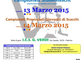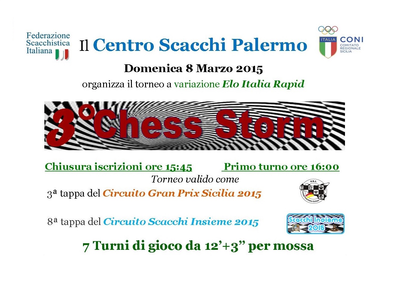 3° Chess Storm Domenica, 08 Marzo 2015 alle ore 15:45, il Centro Scacchi Palermo organizza il torneo  “3° Rapid Chess Storm“, che si svolgerà presso la ns. sede in Via E. Fermi, 8 – Palermo. Si giocheranno 7 turni da 12’+3″ a mossa per giocatore. Il torneo è valido sia per il Circuito Scacchi Insieme 2015, sia per il Circuito Gran Prix Sicilia 2015 con variazione ELO Italia Rapid.
