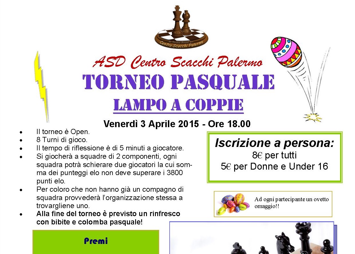 Venerdi, 03 Aprile 2015 alle ore 17:30, il Centro Scacchi Palermo organizza il “ Torneo Pasquale Lampo a coppie“, che si svolgerà presso la ns. sede in Via E. Fermi, 8 – Palermo.