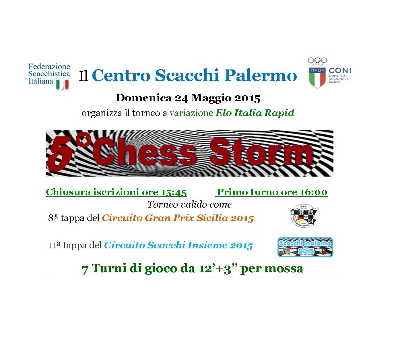 Domenica, 24 Maggio 2015 alle ore 15:45, il Centro Scacchi Palermo organizza il torneo “5° Rapid Chess Storm“, presso la propria sede in Via E. Fermi, 8 – Palermo.