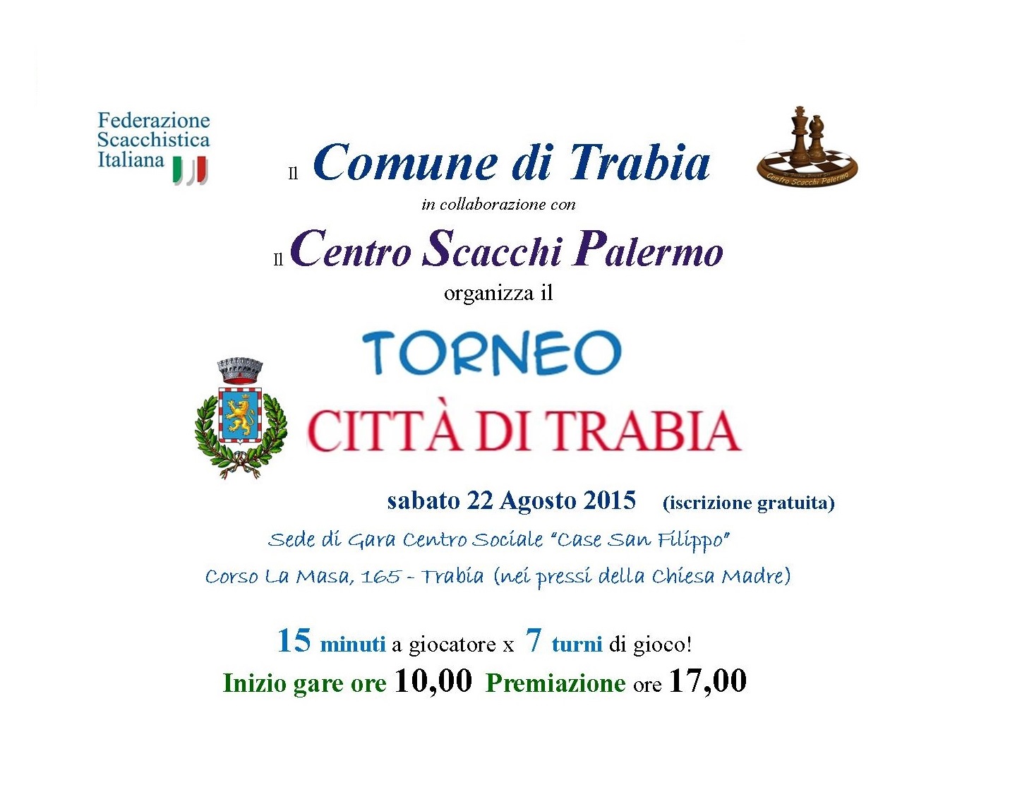 Il comune di Trabia con la collaborazione del Centro Scacchi Palermo organizza il torneo di scacchi “Città di Trabia”, attività che si inserisce nel programma estate Trabia 2015.