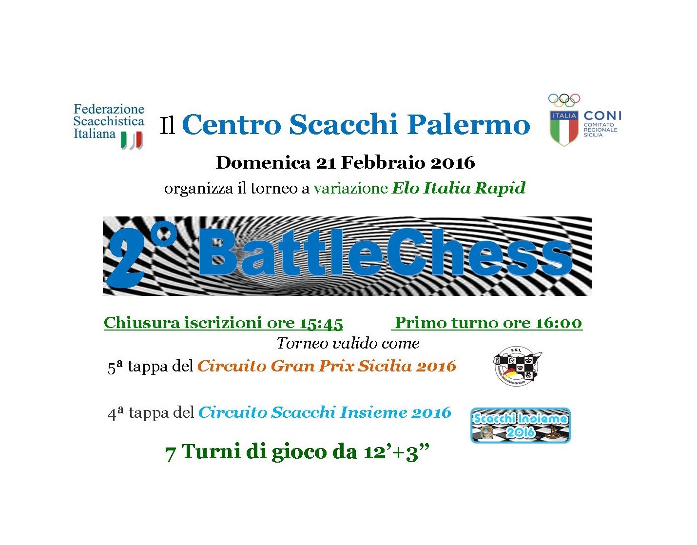 Domenica 21 febbraio 2016 alle ore 15:30, presso la sede del Centro Scacchi Palermo, si svolgerà il torneo Rapid “2° Battle Chess, valido come 4^ tappa del Circuito Scacchi Insieme e come GP Sicilia a variazione Elo Rapid Italia.
