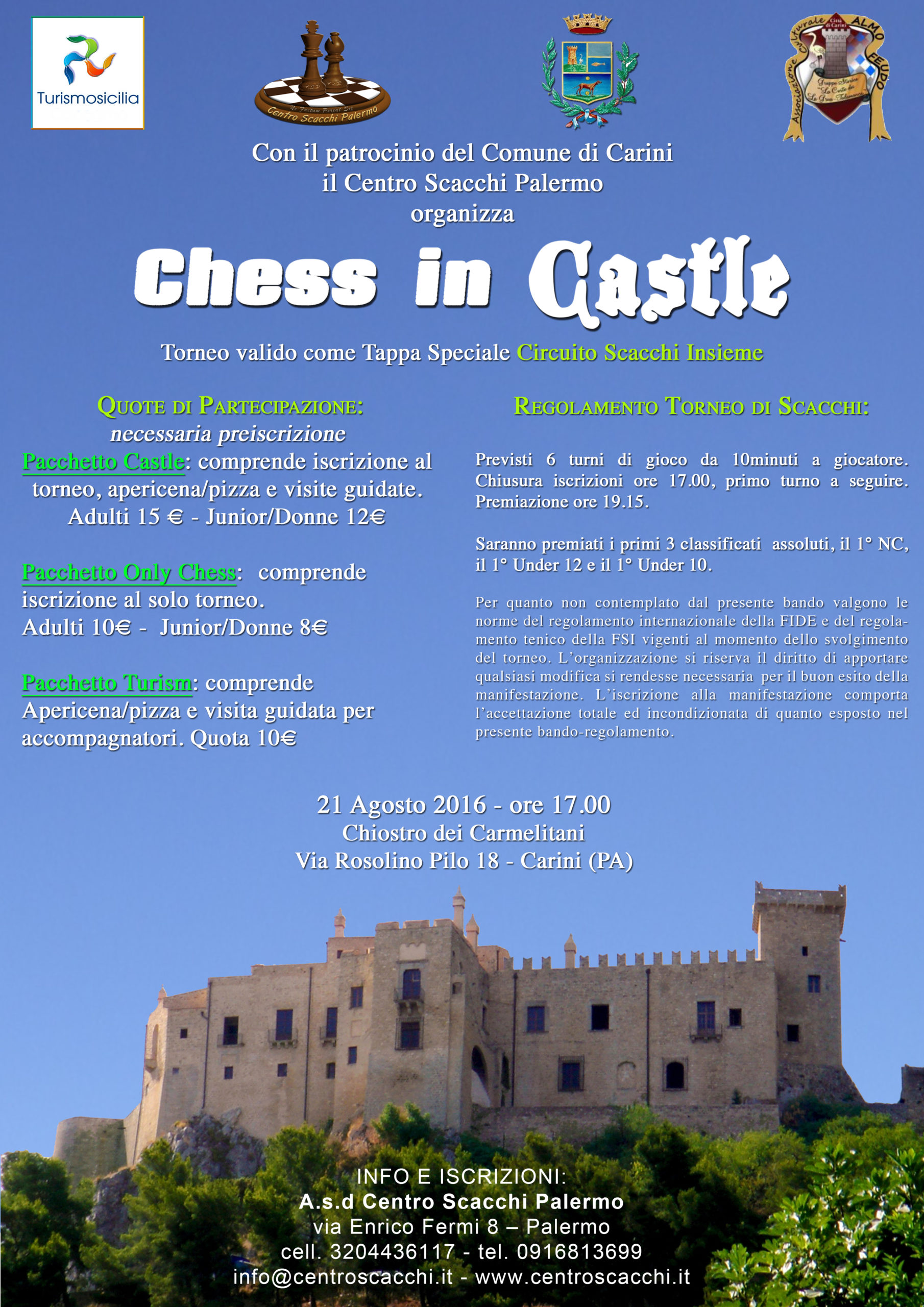 locandina-scacchi-castello copia Domenica 21 Agosto ore 17.00. Previsti 6 turni di gioco da 10minuti a giocatore. Sia per i giocatori che per gli accompagnatori è previsto Apericena/pizza e visita guidata al Castello. Il Torneo si concluderà alle 19.15 circa e a seguire si svolgerà l’apericena e la visita guidata. Maggiori informazioni sul bando.