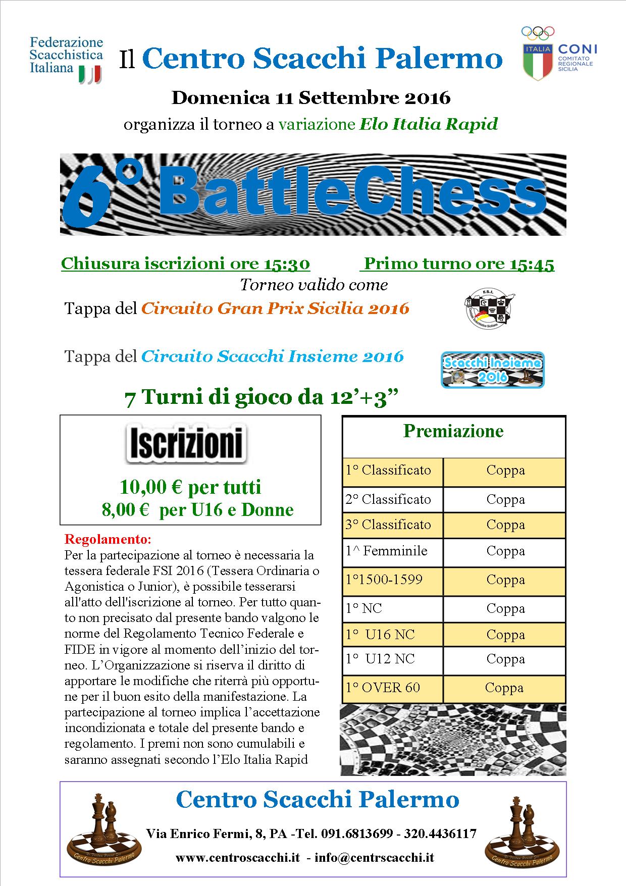 Domenica 11 settembre 2016 alle ore 15:30, presso la sede del Centro Scacchi Palermo, si svolgerà il torneo Rapid “6° Battle Chess, valido come tappa del Circuito Scacchi Insieme e come GP Sicilia a variazione Elo Rapid Italia.