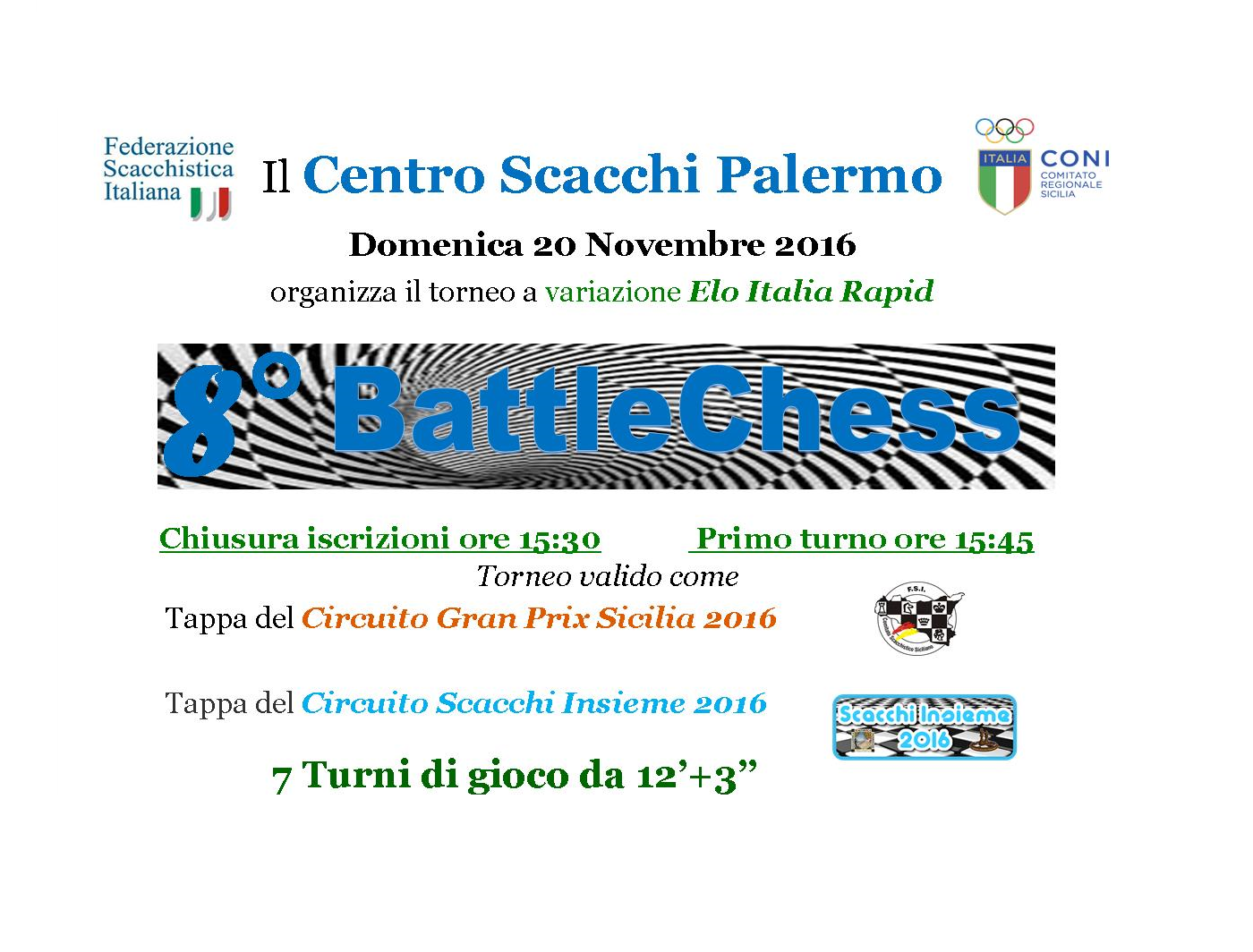 Domenica 20 Novembre 2016 alle ore 15:30, presso la sede del Centro Scacchi Palermo, si svolgerà il torneo Rapid “8° Battle Chess, valido come tappa del Circuito Scacchi Insieme e come GP Sicilia a variazione Elo Rapid Italia. Previsti 7 turni da 12’+3” a mossa. Iscrizione: € 10,00 (U16 e Donne € 8,00). Bando completo]]>