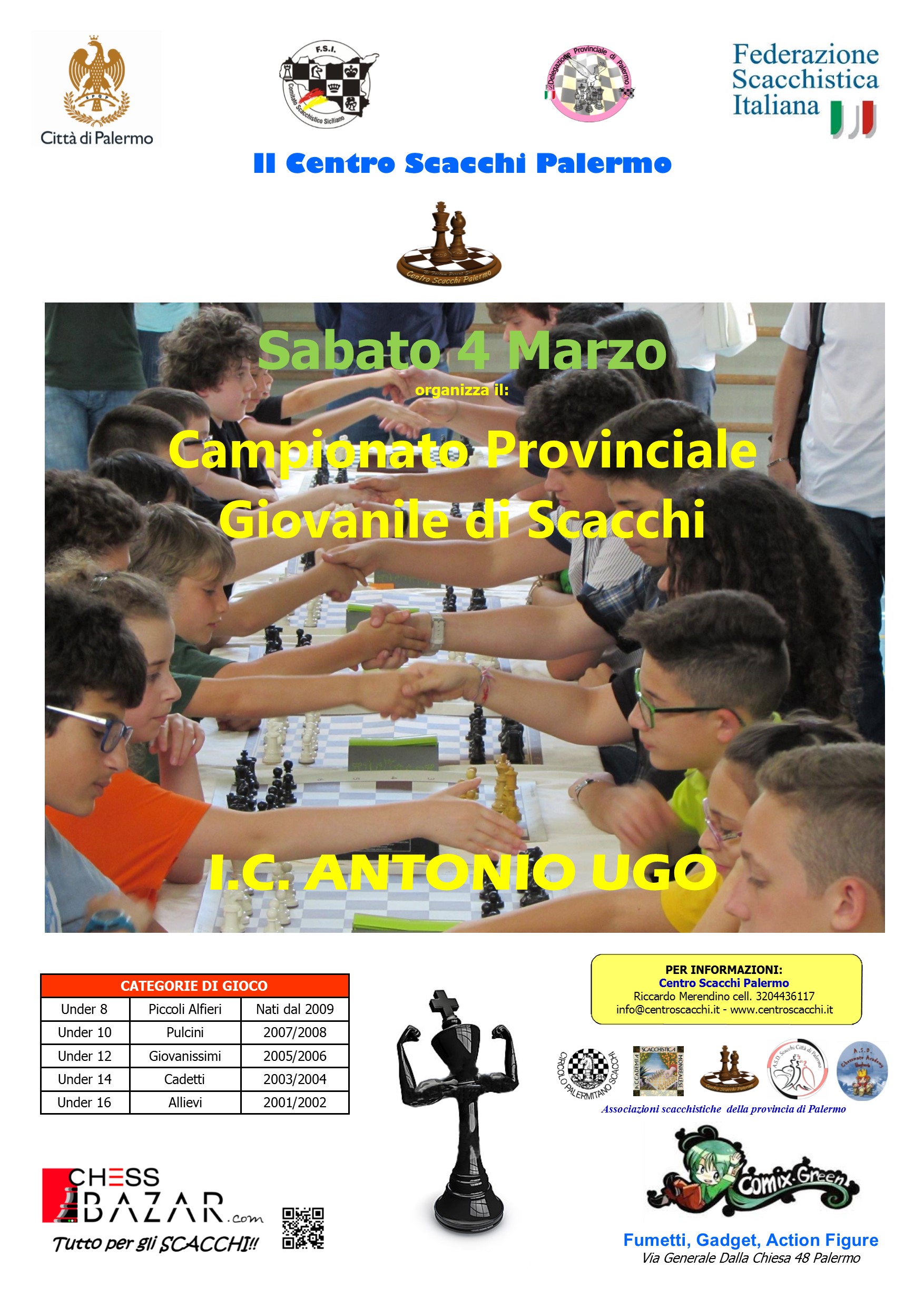 Campionati Giovanili di Scacchi sia nella formula individuale che in quella scolastica a squadre. Anche quest’anno, nei giorni 3 e 4 marzo si svolgerà a Palermo l’edizione numero ventotto, questa volta presso l’auditorium dell”I.C. Antonio Ugo di Via E. Arculeo, 39. Nel ringraziare il Dirigente Scolastico, il Prof. Riccardo Ganazzoli, per la disponibilità mostrata pubblichiamo tutti i bandi e la modulistica necessaria per le iscrizioni. Come sempre restiamo a disposizione di tutti gli interessati, sia presso la nostra sede (Centro Scacchi Palermo via Enrico Fermi , 8 dalle 17,00 alle 20 di ogni giorno esclusi i festivi), che tramite cellulare al 320 44361178. Vi aspettiamo all’I.C. Antonio Ugo !! 03/03/2017 – Campionati Scolastici a Squadre MIUR ed Trofei Scolastici a Squadre FSI (compreso il nuovo Torneo di Selezione Provinciale) bando CS 2017 bando torneo di selezione moduloiscrizione torneo selezione provinciale 04/03/2017 – Campionati Individuali Giovanili (categorie Under 8, 10, 12, 14, 16, 20 maschili e femminili) bando CIG provinciale 2017; Bando Under 20 Modulo iscrizione 2017 Campionati Individuali]]>