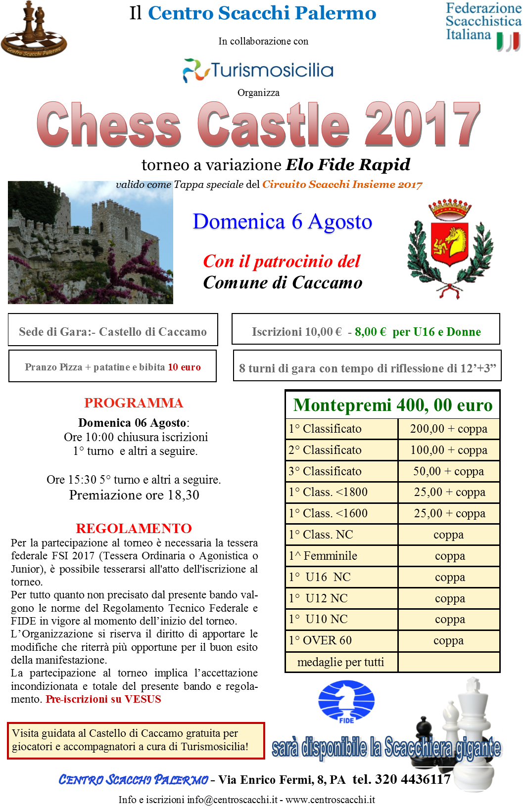 Chess Castle 2017“. La manifestazione, organizzata in collaborazione con Turismosicilia e con il patrocinio del comune di Caccamo, sarà valida come tappa speciale del circuito “Scacchi Insieme“. Montepremi di 400 euro. Vi aspettiamo! Bando caccamo 2017]]>