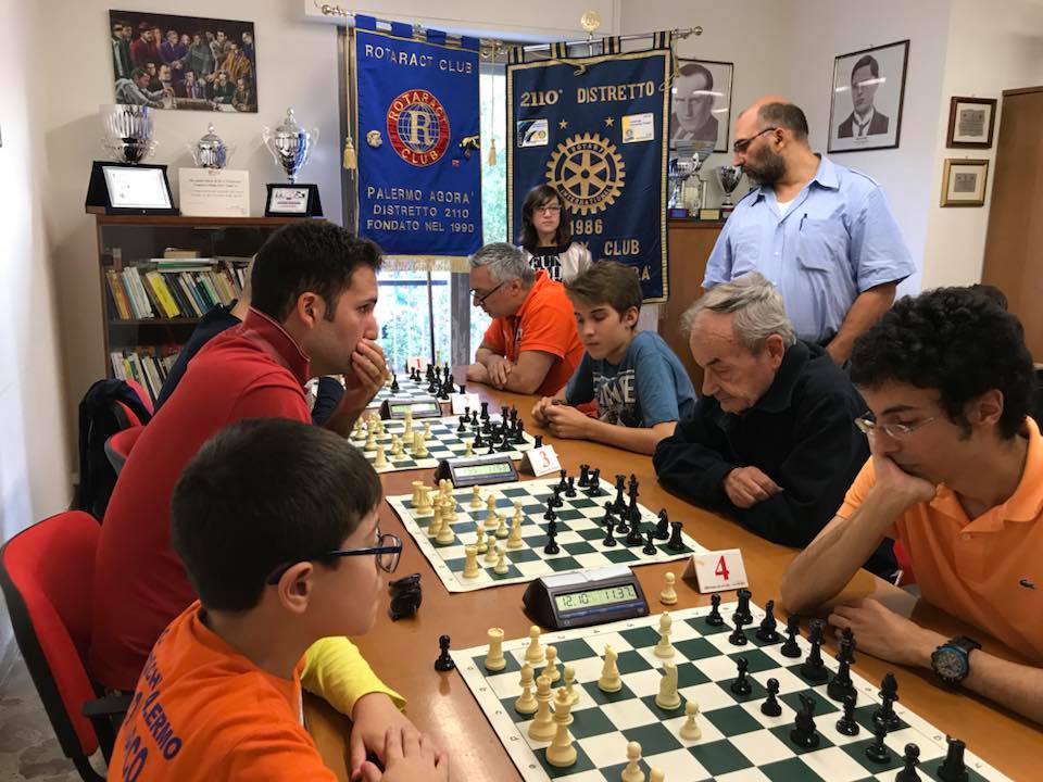 Sabato 21 Ottobre si è svolto, presso le sale del Centro Scacchi Palermo, in collaborazione con il Rotary e Rotaract Palermo Agorà, un torneo rapid, 7 turni da 12’+3” a mossa. Alla manifestazione hanno partecipato 27 giocatori, alcuni dei quali “scacchizzati” nella settimana appena trascorsa, da Giuseppe Palazzotto, attratti dall’idea di contribuire ad un evento in cui gran parte del ricavo sarebbe stato destinato in beneficenza, per sostenere il “Laboratorio del saper fare”, (un laboratorio artigianale finalizzato all’integrazione della cultura Ghanese e della cultura Siciliana). A sorpresa, alla fine dei sette turni di gara, si impone su tutti Riccardo Campanella con 6 punti, superando di mezzo punto il secondo classificato Amedeo Favitta e coronando così un ottima prestazione. Antonino Lo Piccolo conquista la terza piazza precedendo ai bucholz Francesco Lorito e Francesco Bruno. Primo classificato della fascia <1600 è Ivan Bertoldo con 4,5, mentre con lo stesso punteggio Marco Miosi conquista la fascia Under 14. Vince il premio femminile, con 4 punti, Enrica Zito mentre il premio Under 10 va a Giuseppe Pampillonia con 3 punti. Giorgia La Marca, con lo stesso punteggio, vince il premio speciale Rotary. La manifestazione, arbitrata da Giuseppe Palazzotto, si è conclusa con una premiazione festosa, gestita da Fabrizio Ganci. Classifica Torneo Beneficenza