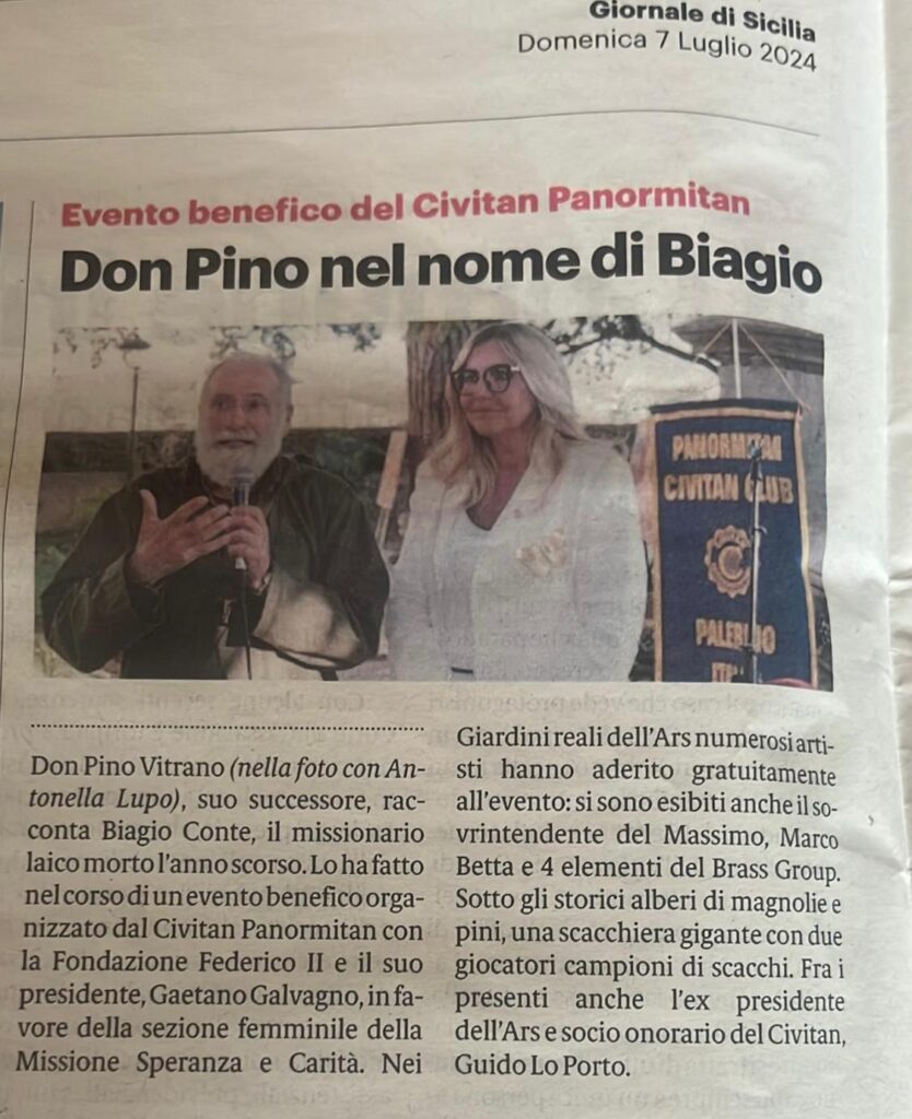 L’asd Palermo Scacchi è stata presente il 5 luglio all’evento Come è profondo il mare organizzato presso i Giardini Reali di Palazzo dei Normanni di Palermo, dal Civitan Club Panormitan, di concerto con la Fondazione Federico II, per sostenere Missione Speranza e Carità, Sezione Femminile di Fratel Biagio Conte.